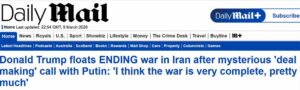 Ditto. Just no mention of the fact the world’s two foremost terrorist regimes – no other state comes close – appear now to be at the wrong end of a successful war of economic attrition in which the state they have bullied for half a century is reliant neither on sea or air power, nor the conventions of twentieth century warfare. Rather, on a drone and hypersonic missile superiority to which neither of the rogue states has an answer. That and her power, hitherto leashed though widely advertised in the countdown to February 28, to plunge the world into economic disarray.